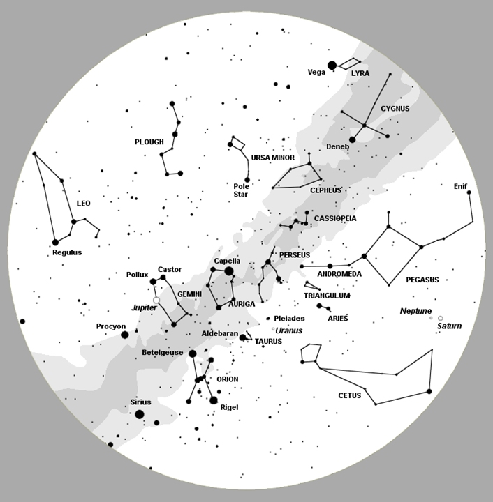 The map shows the brighter stars that are visible to the unaided eye. Some of the more distinctive constellations are outlined.