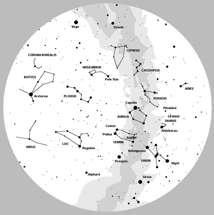 The map above shows the night sky as it will appear from central Scotland at the time and date shown. The point in the sky directly overhead is at the centre of the map; the outer circle is the horizon with the cardinal compass points in the direction shown.