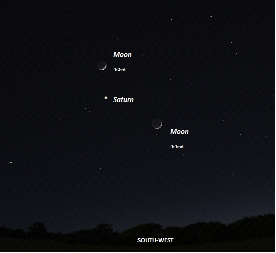 The crescent Moon meets Saturn - view to the south-west at 6.00pm on Thursday January 22nd and Friday January 23rd